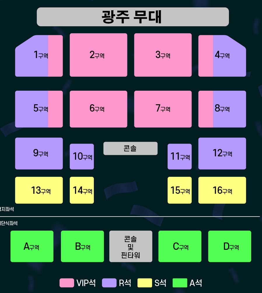 A. VIP/R석은 무대 근접, S/A석은 정면 뷰 위주로 가성비 좋습니다.