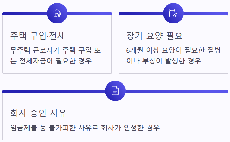 - 무주택 근로자가 주택 구입 또는 전세자금 필요 시
